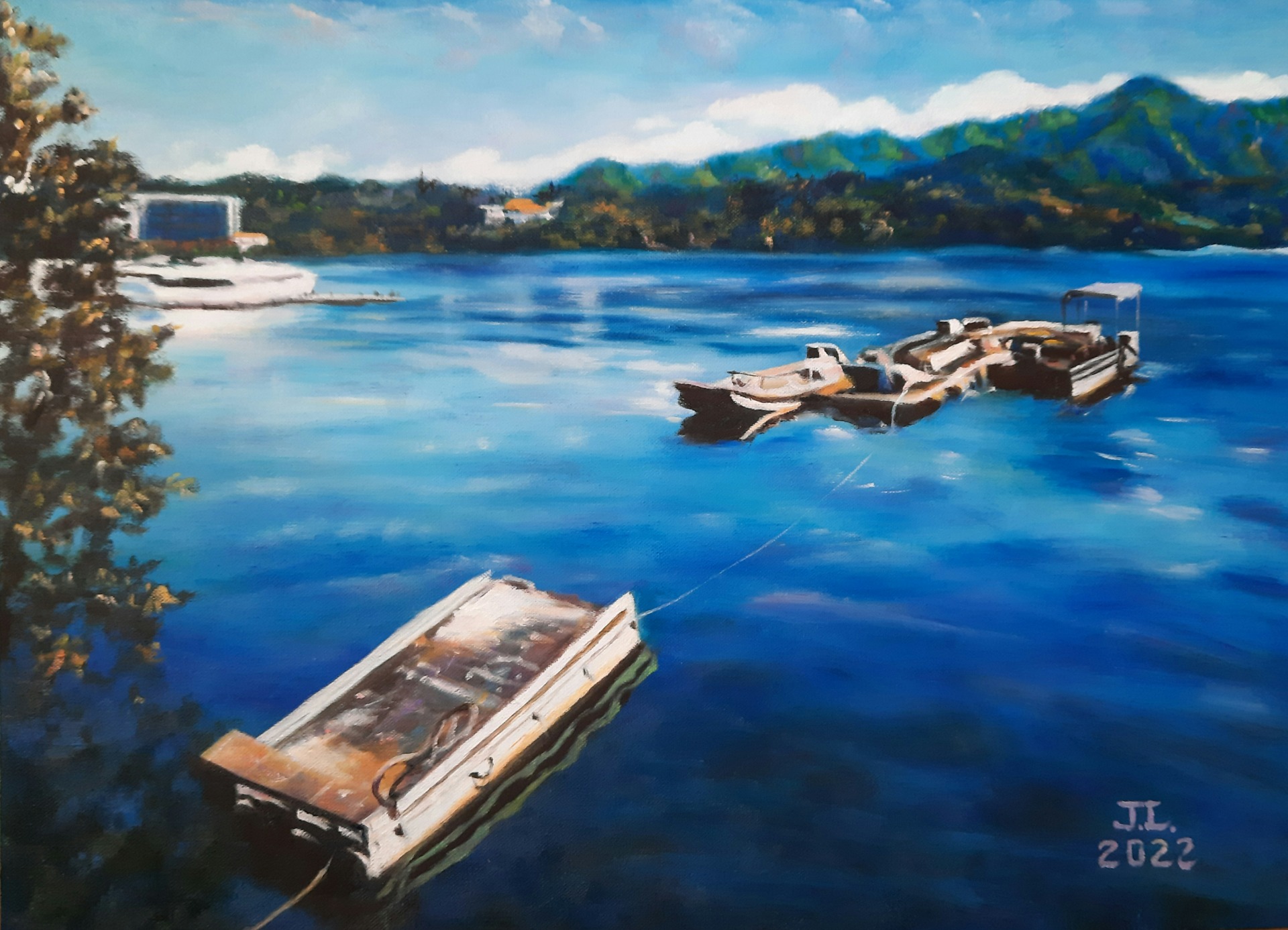 這是我取材自日月潭環湖步道的景色. 兩葉輕舟的一端固定於岸邊, 形同一座穩定的錨. 中間緊緊相繫的繩索, 好像母親與嬰兒的臍帶, 親情的關係一輩子環繞. 又像天父愛祂的孩子一樣, 雖然有時候那條線細小到幾乎看不到, 卻仍都存在. 當回首來時路, "牽引" 已然成為一種不可或缺的力量.